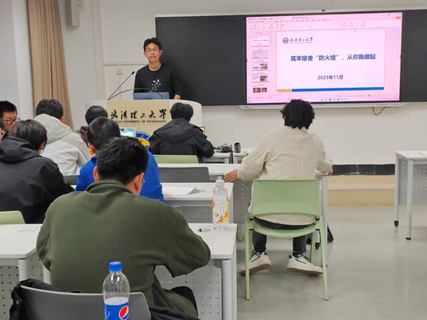 为提高同学们的消防安全意识,帮助同学们掌握消防知识及逃生技能,12月5日晚8时,车辆类2308班于博学北楼4-308教室开展“牢筑宿舍‘防火墙’,从你我做起”消防安全主题班会,此次班会由班长曹昌平主持,车辆类2308班全班同学参与。