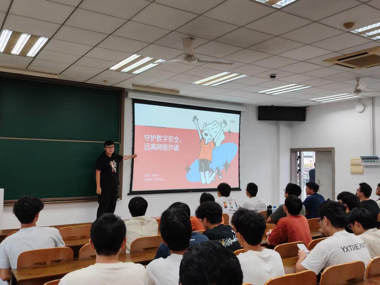 班会伊始,黄林达同学首先阐述了当前网络安全面临的严峻形势以及开展防诈教育的紧迫性与重要性。他指出,随着信息技术的飞速发展,网络空间已成为学习、生活的重要领域,但同时也潜藏着信息泄露、网络诈骗等各类风险。增强网络安全防护意识,掌握必要的防诈技能,是新时代青年必备的素养,也是维护自身合法权益、共建清朗网络空间的必然要求。
