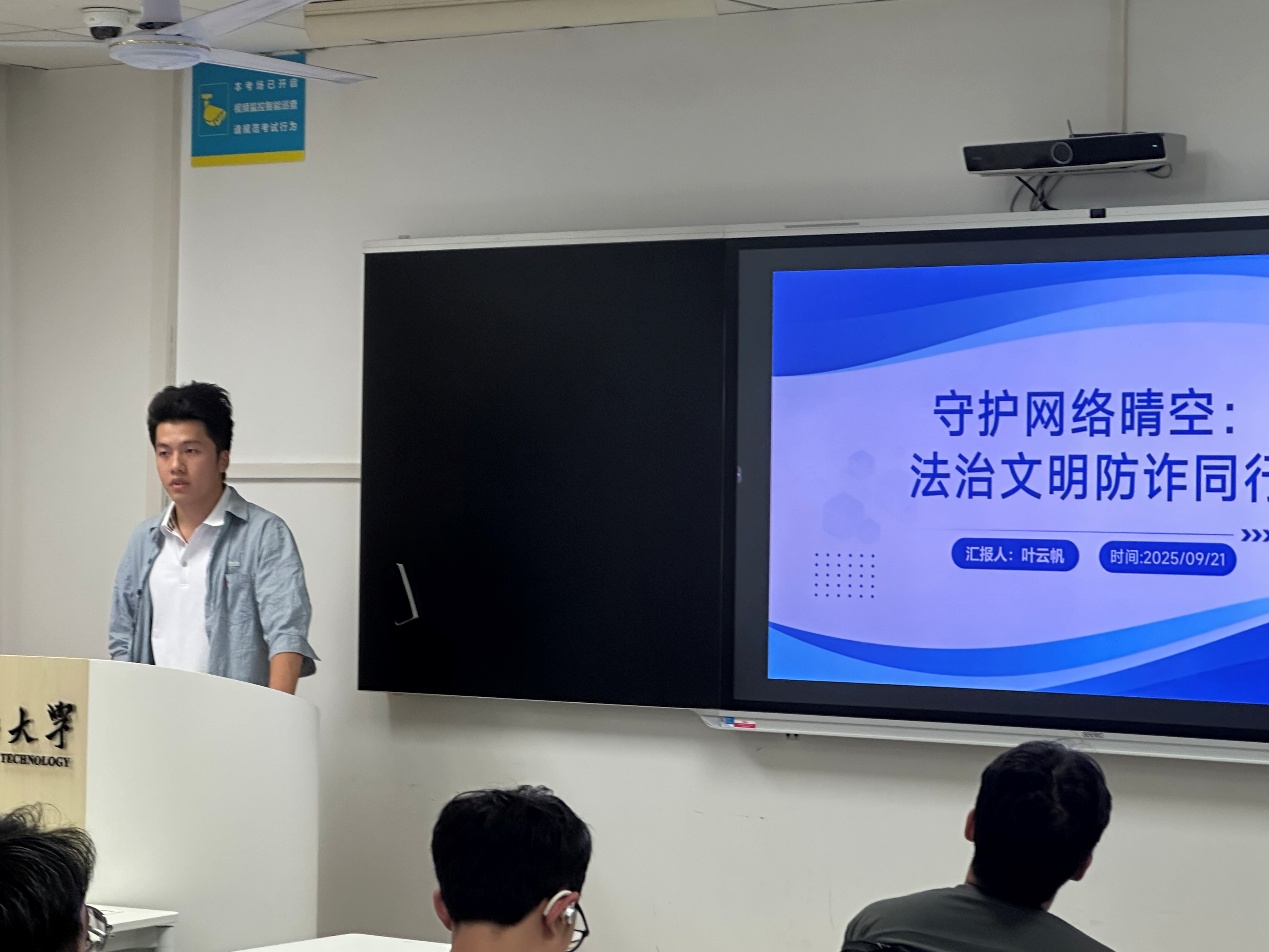 为提升全体同学的网络安全意识和法制素养,帮助大家认清网络诈骗的常见手段、筑牢防范思想防线,共同营造安全、文明、健康的网络环境,本班于9月21日下午四点召开“守护网络晴空,法制文明防诈同行”主题班会。此次班会由班长叶云帆主持,车辆2402班全体同学参与。